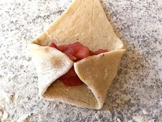 - Læg en skefuld æblekompot på hver, se på billederne herunder hvordan det gøres. Rul æblehornene sammen, og stil dem på en bageplade med bagepapir.
