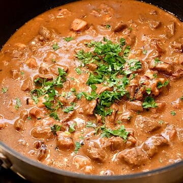 - Bøf Stroganoff (med kartoffelmos eller ris)