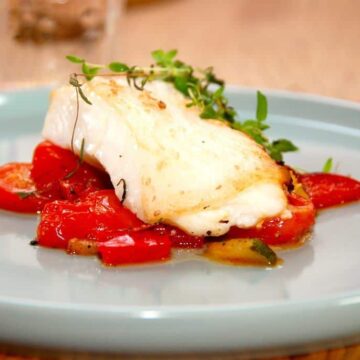 Dampet hellefisk med bagte grøntsager