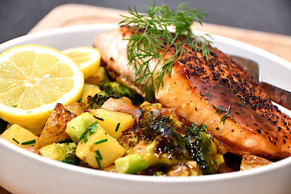 Mængden af de enkelte ingredienser kommer selvfølgelig an på sulten, så der kan justeres på såvel laks som kartofler og broccoli. God fornøjelse.