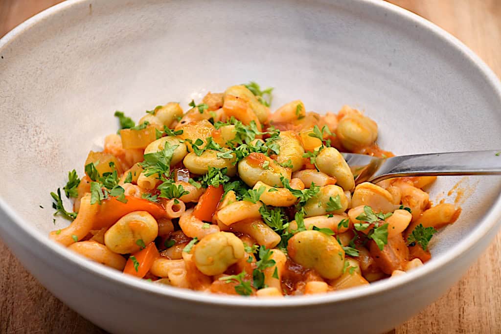 Her får du min opskrift på favabønner i tomatsauce med bacon og pasta. Det hele lavet i samme gryde, og det er virkelig familievenlig ret.