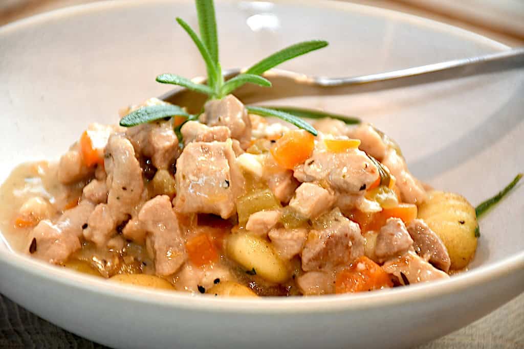 Raguen er en lækker slags kødsovs, som jeg her har lavet med nakkekoteletter, der skæres ud i meget små tern/stykker. Derefter koges den i en times tid. Dertil altså en stegt omgang gnocchi.