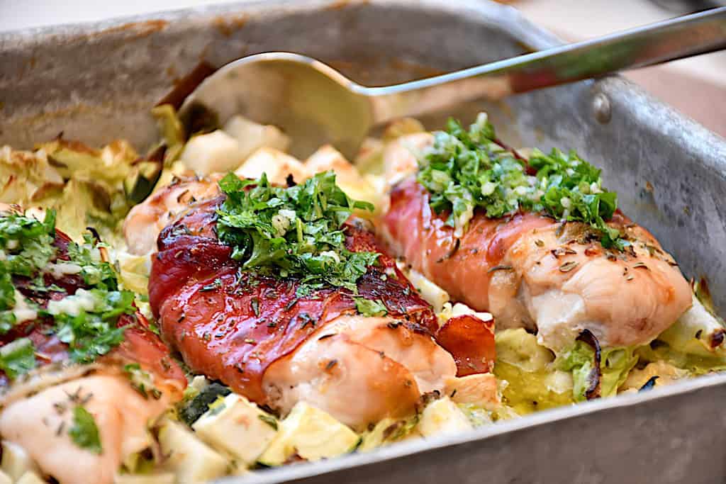 - Imens gøres kyllingen klar. 4 kyllingebryst fileter smøres med 4 tsk sennep, og der drysses med timian, salt og friskkværnet peber. Vikl 4 skiver parmaskinke om kyllingefileter - altså et stykke skinke om hver.