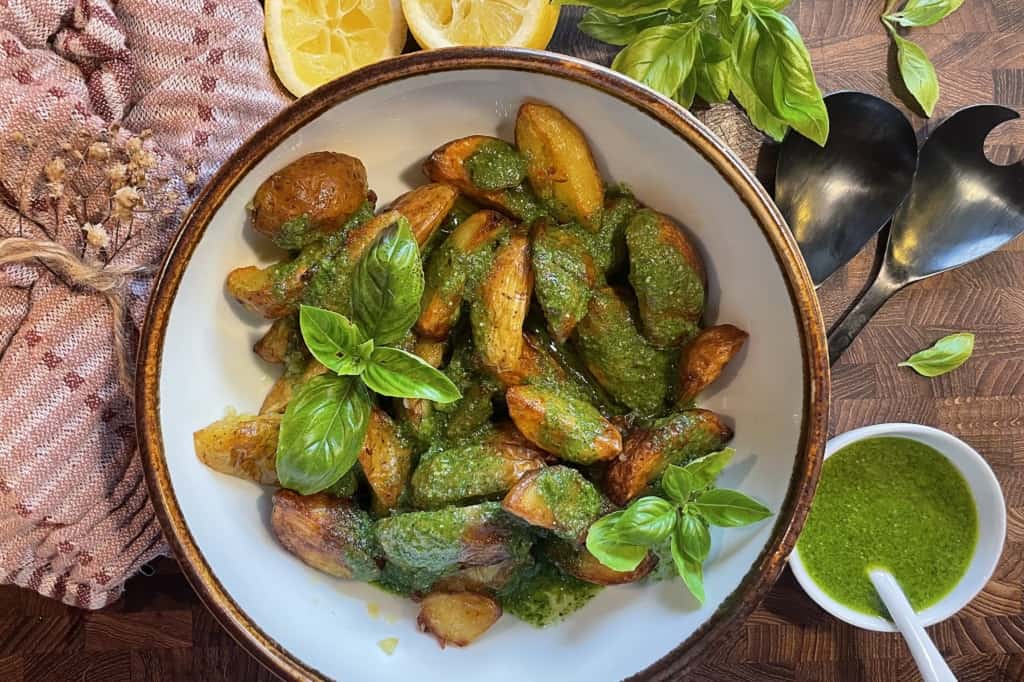 Lækkert tilbehør kan være en nem kartoffelsalat med asparges eller pestokartofler.