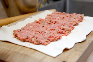 - Fordel nu halvdelen af farsen på butterdejen - se eventuelt billedet længere nede. Farsen lægges på midten og ikke for langt ud til kanten på din butterdej.