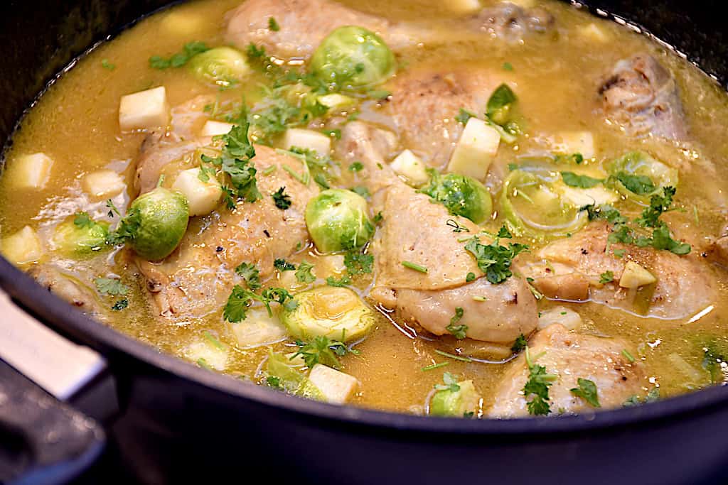 - Læg kyllingestykkerne tilbage i gryden og servér straks.