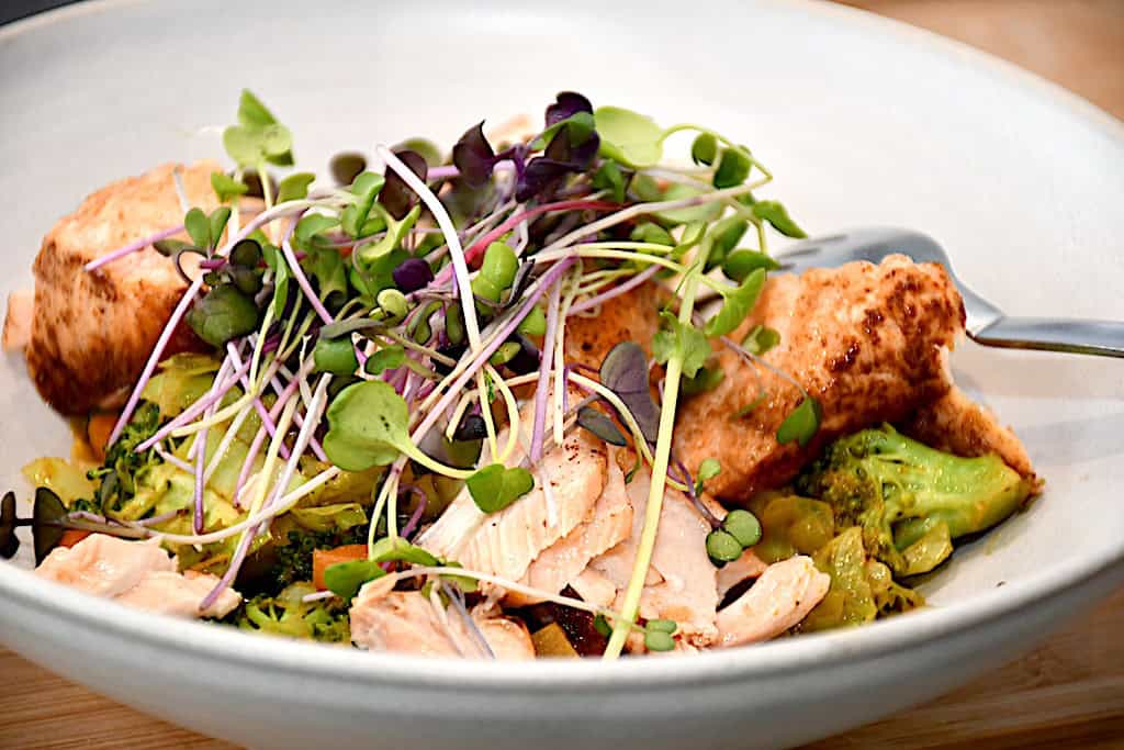 - Anret den karamelliserede kål i dybe tallerkner med stykker af laks fordelt øverst. Kan pyntes med spirer som på billedet.