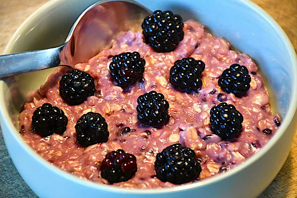 Det eneste vi skal gøre om morgenen, er at tage grøden ud af køleskabet, røre den rundt og toppe med müsli eller bær. Du kan også bruge hjemmelavet kompot, hvis du har noget.