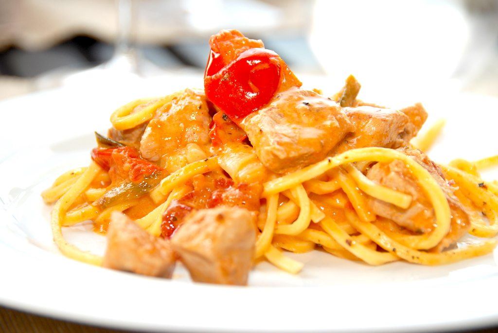 5. Tilsæt så 1 stort løg (hakket) og lad det sautere et lille minuts tid, hvorefter 3 tsk paprika kommes ved sammen med 4 dl piskefløde. For en mere kalorielet version anvendes madlavningsfløde eller mælk. Lad det koge hurtigt op.