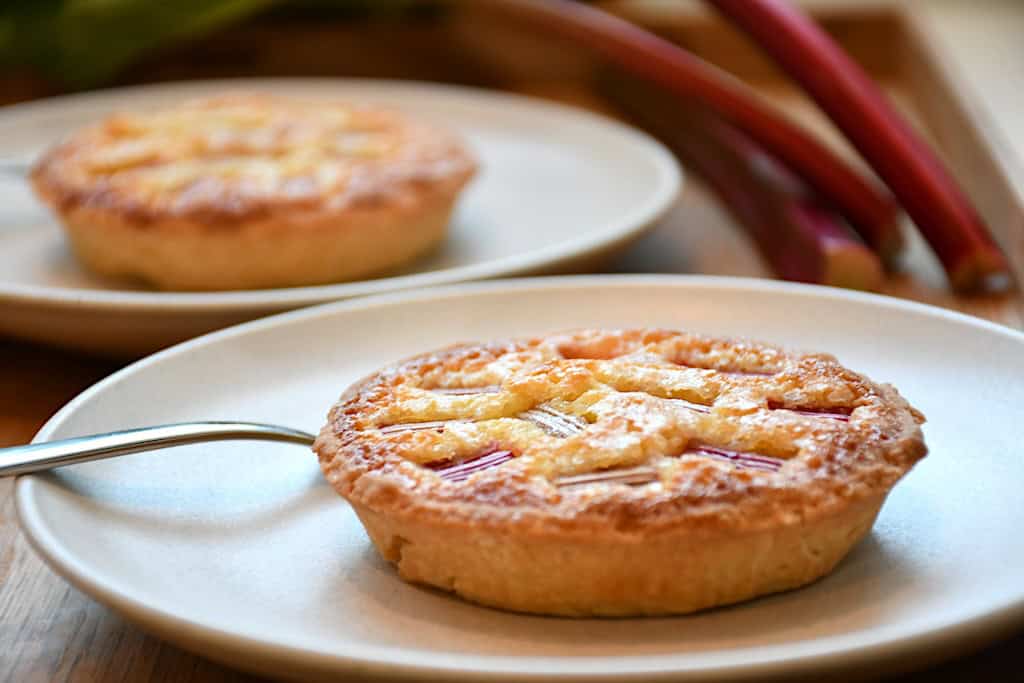 Du vil elske de her portionstærter med rabarber med deres sprøde mørdejsbund bløde og søde mazarinfyld og syrlige rabarber på toppen.