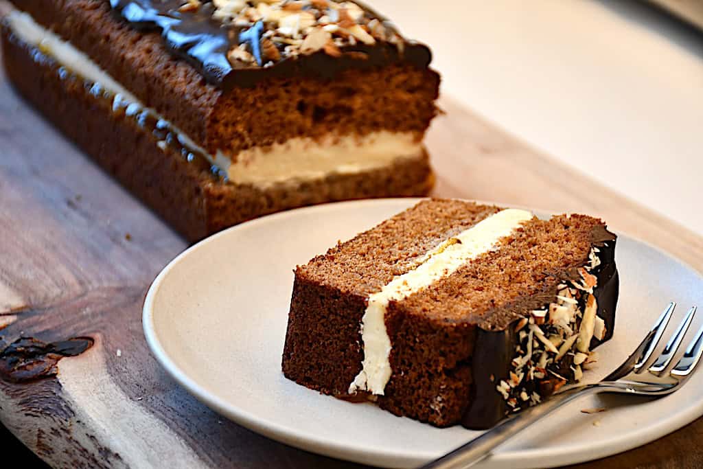 Den færdige sirupskage med smørcreme er klar til servering. Rester opbevares på køl.